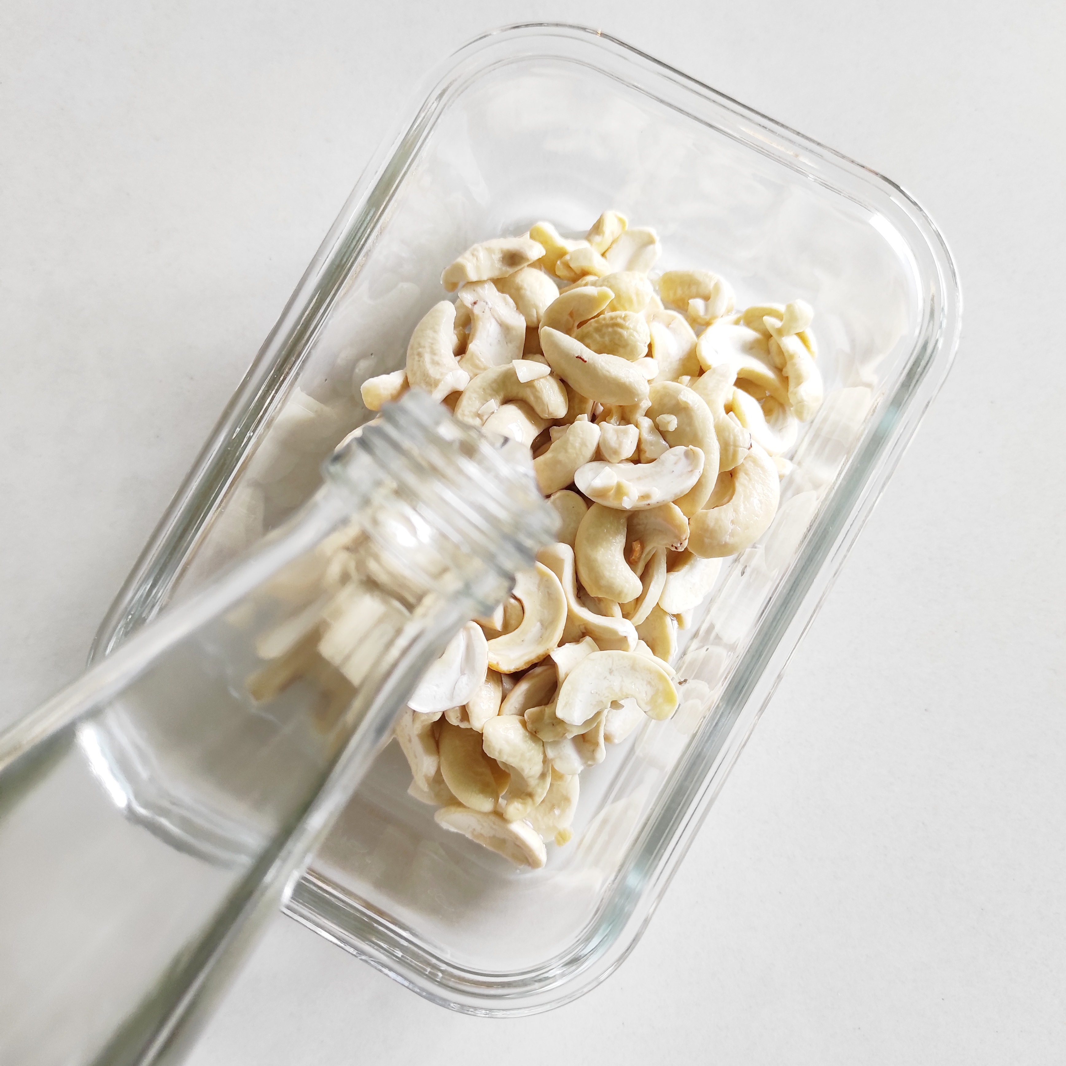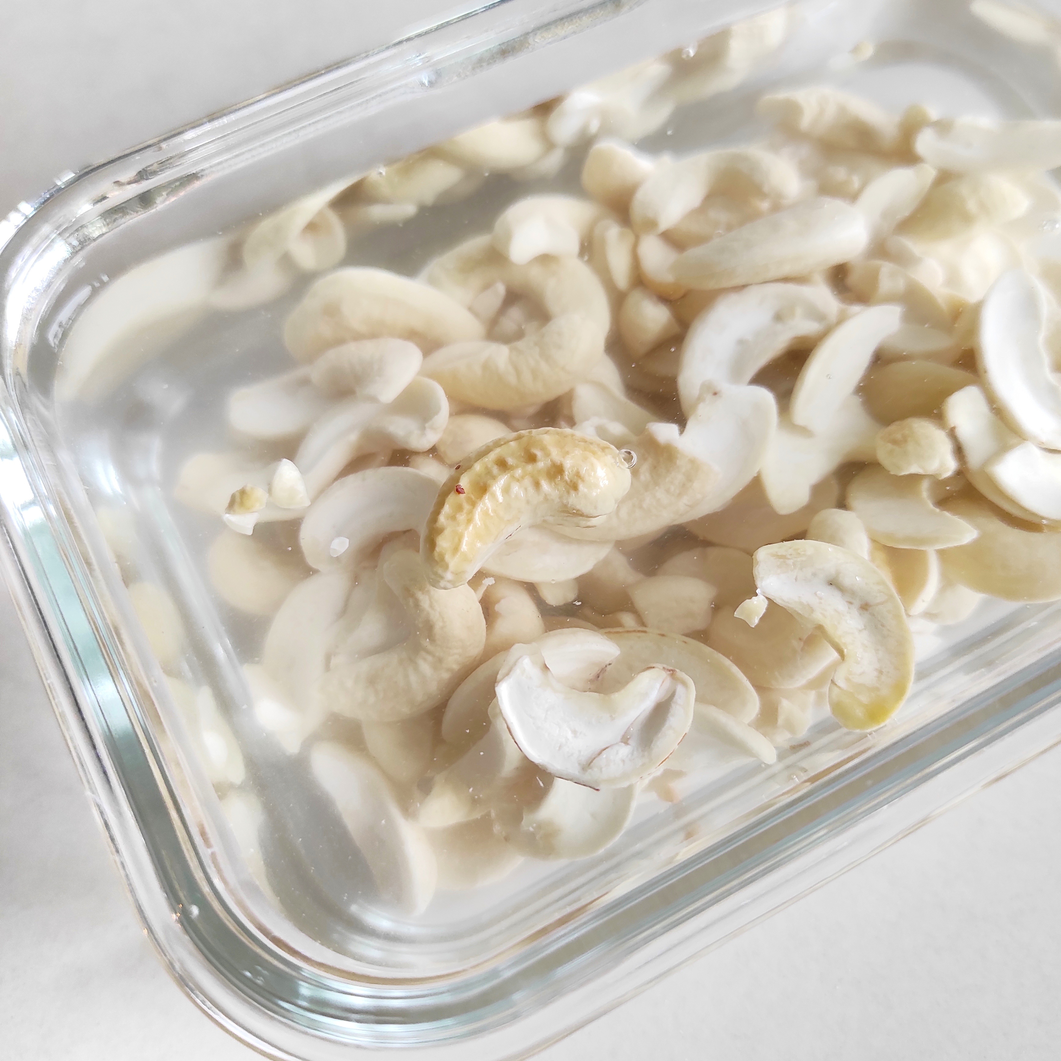 믹서기의 성능이 뛰어나다면 바로 갈아줘도 되지만 보통은 캐슈밀크 만들기 전에 먼저 캐슈넛을 불려줘요. 물에 가볍게 씻은 캐슈넛을 적당한 용기에 담고 완전히 잠길 정도로 물을 부은 후 짧게는 서너 시간, 길게는 하룻밤 불려주면 돼요.