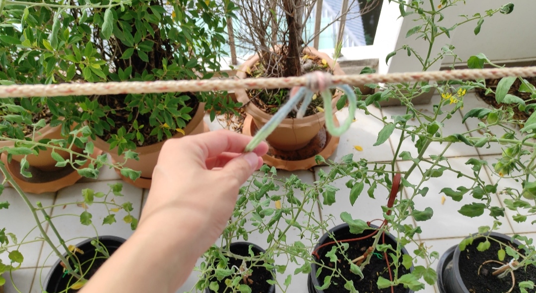 저는 다이소 지지대 실패 후 집에 굴러다니던 대나무를 지지대로 사용했고, 화분에 방울토마토 기르기 스폿 상공에 마침 빨랫줄이 있어서 끈을 이용해 줄기를 빨랫줄에 묶어주기도 했어요. 방울토마토에게 빨랫줄을 양보해야 해서 상당 기간 빨래 너는 데 곤란을 겪게 되었지만 방울토마토를 지지하는 데 빨랫줄이 큰 역할을 했던 것 같아요.