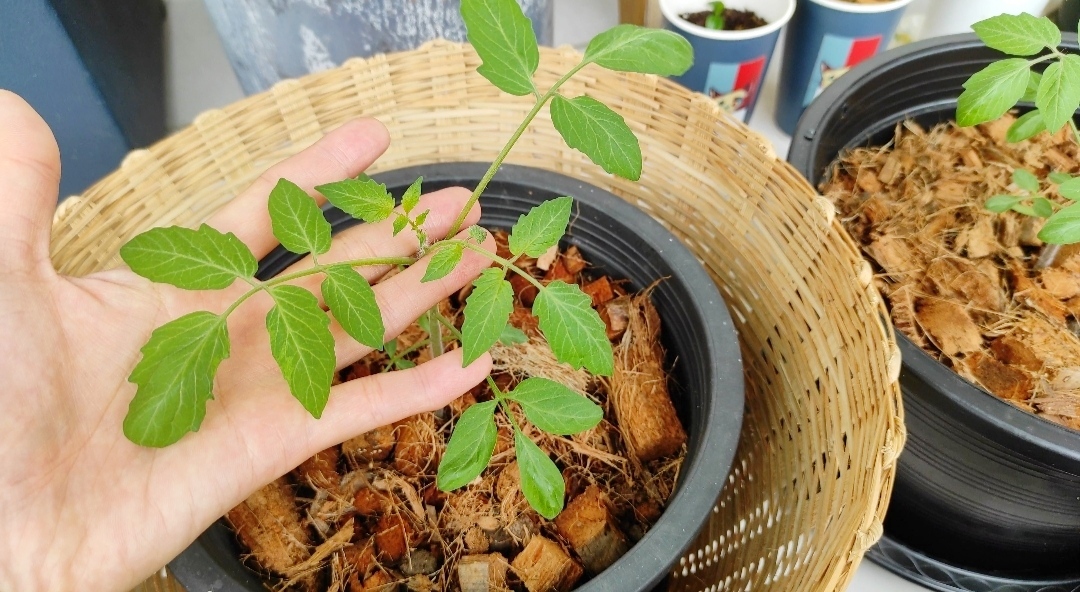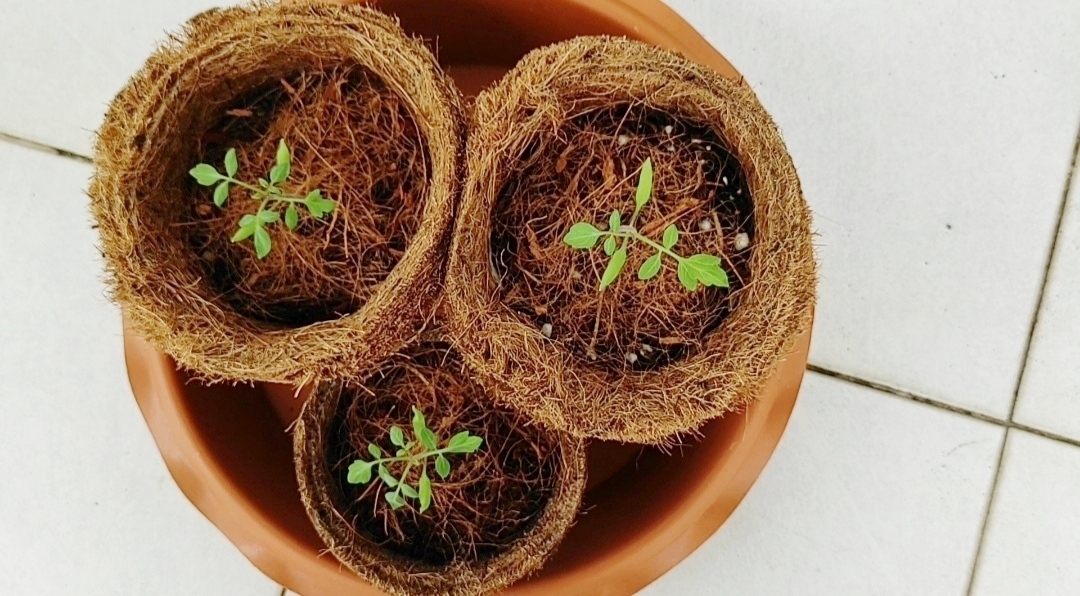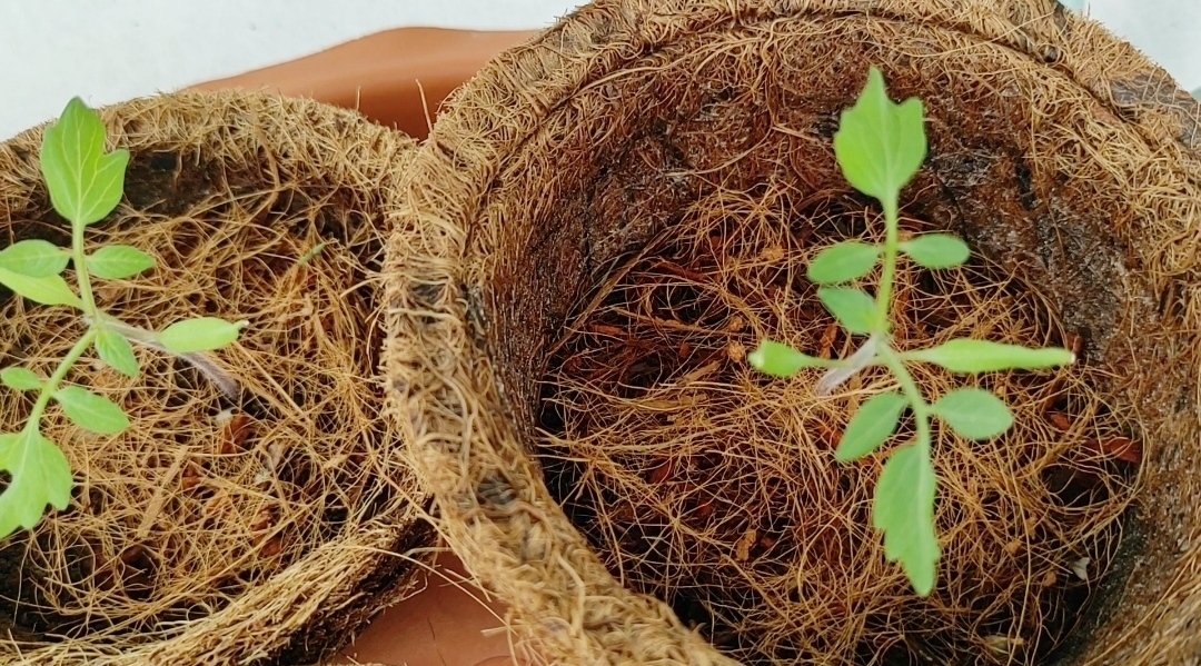 이때 저는 물빠짐이 좋은 코코넛 화분을 사용했는데 뿌리가 아직 많이 발달하지 않은 어린 꼬꼬마 방울토마토를 화분에 키우기에 아주 적합했어요. 코코넛 화분은 플라스틱이 아닌 100퍼센트 자연 재료를 사용한다는 것도 마음에 들고, 식물을 큰 화분으로 분갈이할 때 화분째 그대로 심어줄 수 있어 식물 뿌리가 다칠 염려 없다는 것도 큰 장점인 것 같아요.