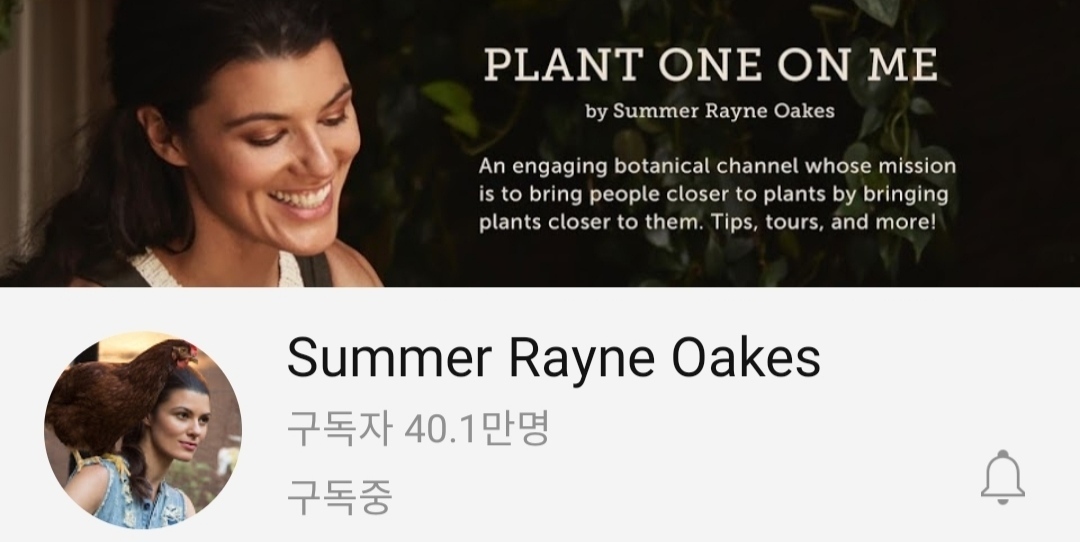 제가 가장 좋아하는 식물 유튜브 채널은 미국 식물 유튜버 서머 레인 오크스(Summer Rayne Oakes)가 운영하는 채널이에요. 연두색 벽을 배경으로 집 안에 식물이 한가득 자리한 핀터레스트 사진으로 너무 유명하지요. 저 역시 핀터레스트에서 그 사진을 보았고 당연히 핀을 저장해두었는데 그게 서머 레인 오크스의 사진인 줄은 나중에 유튜브를 통해 알게 되었어요.